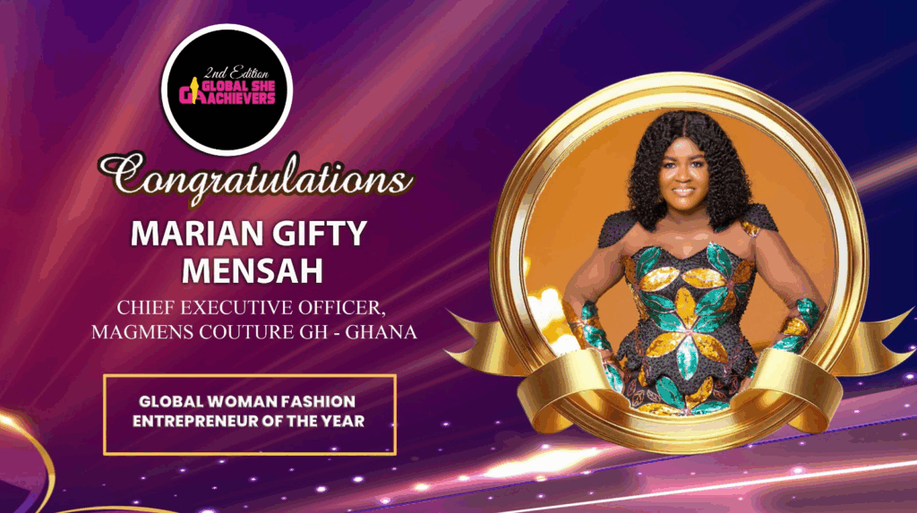 Marian Gifty Mensah’s recognition as the Global woman fashion entrepreneur of the year came on the heels of being crowned as Ghana’s Most Respected CEO in Fashion and Lifestyle Services at the 7th edition of the Ghana’s Most Respected CEO’s Awards.
